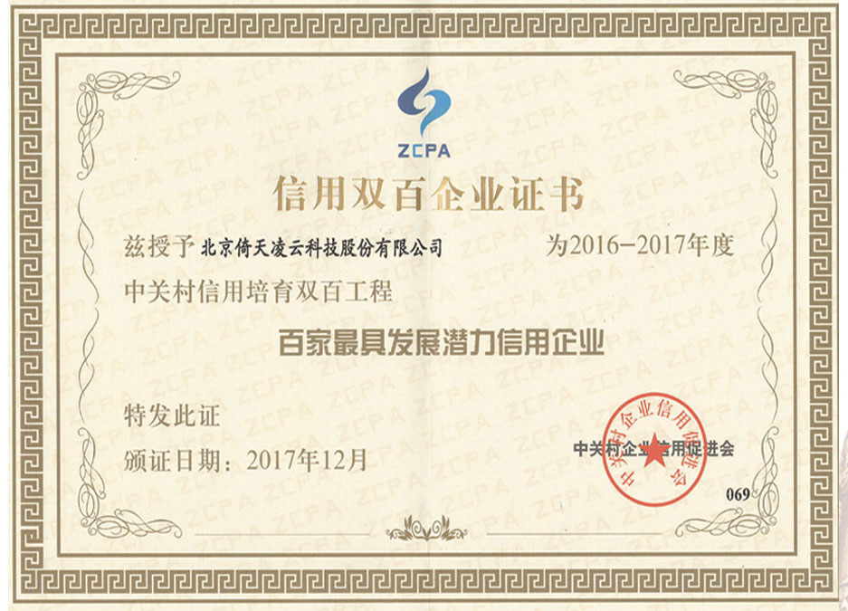 榮獲中關(guān)村信用培育雙百工程“百家最具發(fā)展?jié)摿π庞闷髽I(yè)獎(jiǎng)”。
